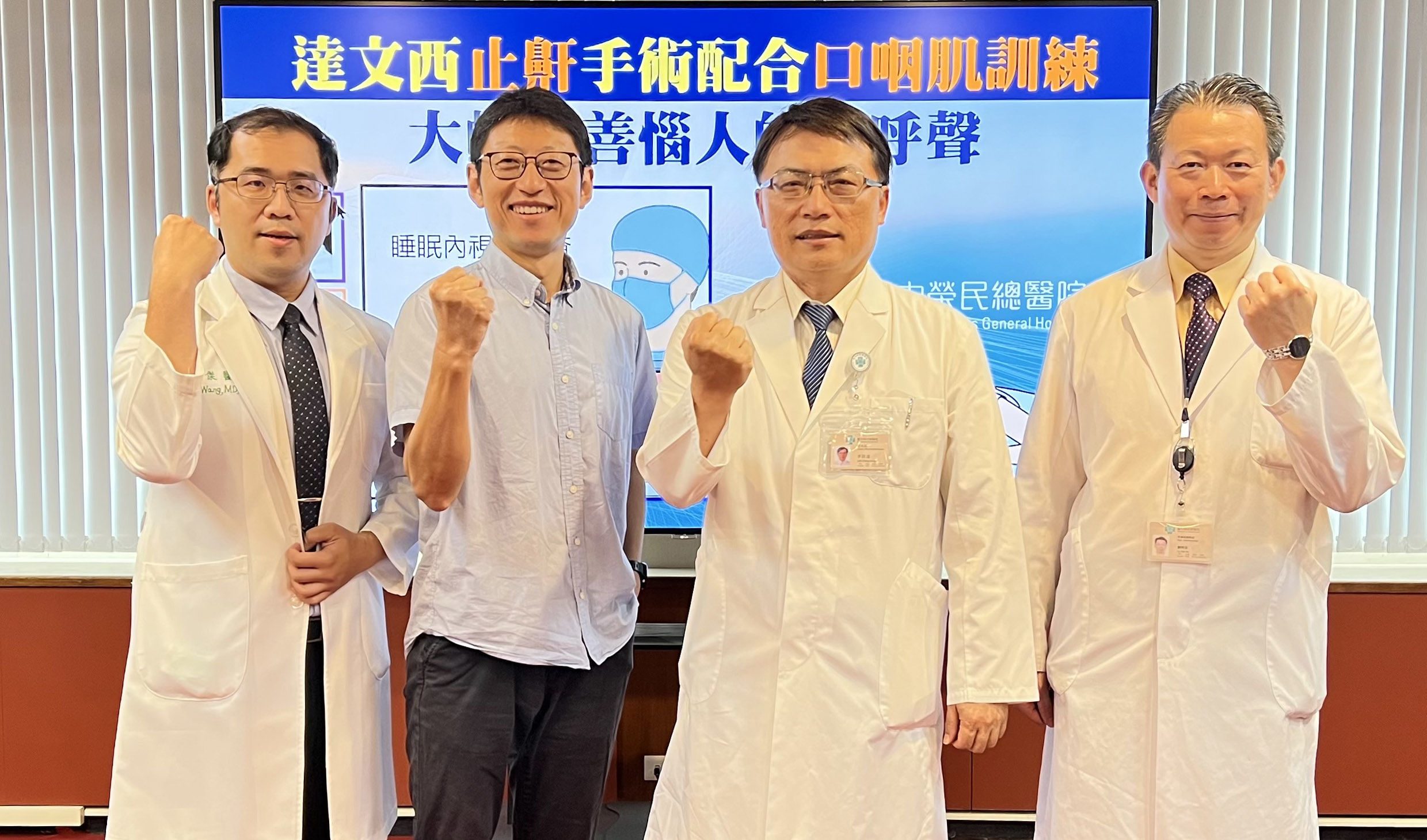周先生(左2)因配戴陽壓呼吸器治療打呼無效後轉至臺中榮總,經睡眠內視鏡檢查、達文西止鼾手術,術後配合口咽肌訓練及減重,有效解決睡眠呼吸中止問題
