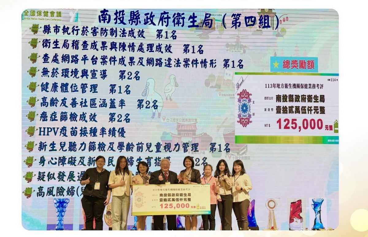 南投縣衛生局此次獲頒獎項有:保健類總成績優等獎、績優分組第一名計7項:(1)健康體位管理、(2)新生兒聽力篩檢及學齡前兒童視力管理、(3)疑似發展遲緩兒童門診服務量能量、(4)高風險婦(兒)追蹤關懷服務。菸害防制業務:(5)縣市執行菸害防制法成效、(6)衛生局稽查成果與陳情處理成效、(7)查處網路平台案件成果及網路違法案件情形。
