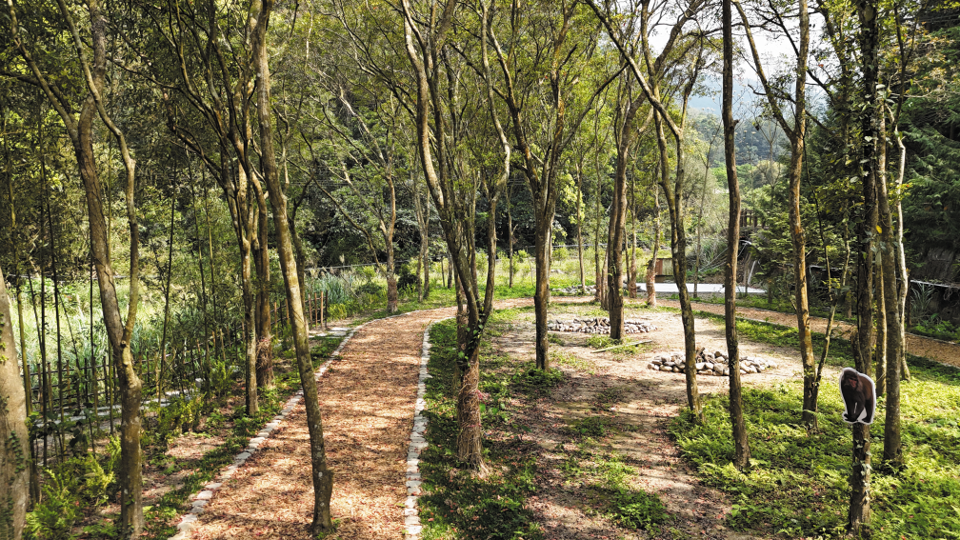 以生態友善為核心,傳承原民傳統文化風貌,為保護當地環境生態,基地動線除配合地形林相調整設計,也融入各項細膩的生態友善思考。農村水保署臺中分署分署長陳榮俊補充說明,步道分別運用高透水性的木屑、碎石、石板等自然資材舖設,搭配人力輔以小型手持器具施作,落實節能減碳精神並重現獵徑風貌。在產業加值面向,新設儲木牆融入地景,為段木香菇產業創造導覽解說空間,服務中心亦增設無障礙坡道及高架舞臺,使不同需求的遊客及表演者,皆能盡情沉醉南庄好客的熱情魅力。