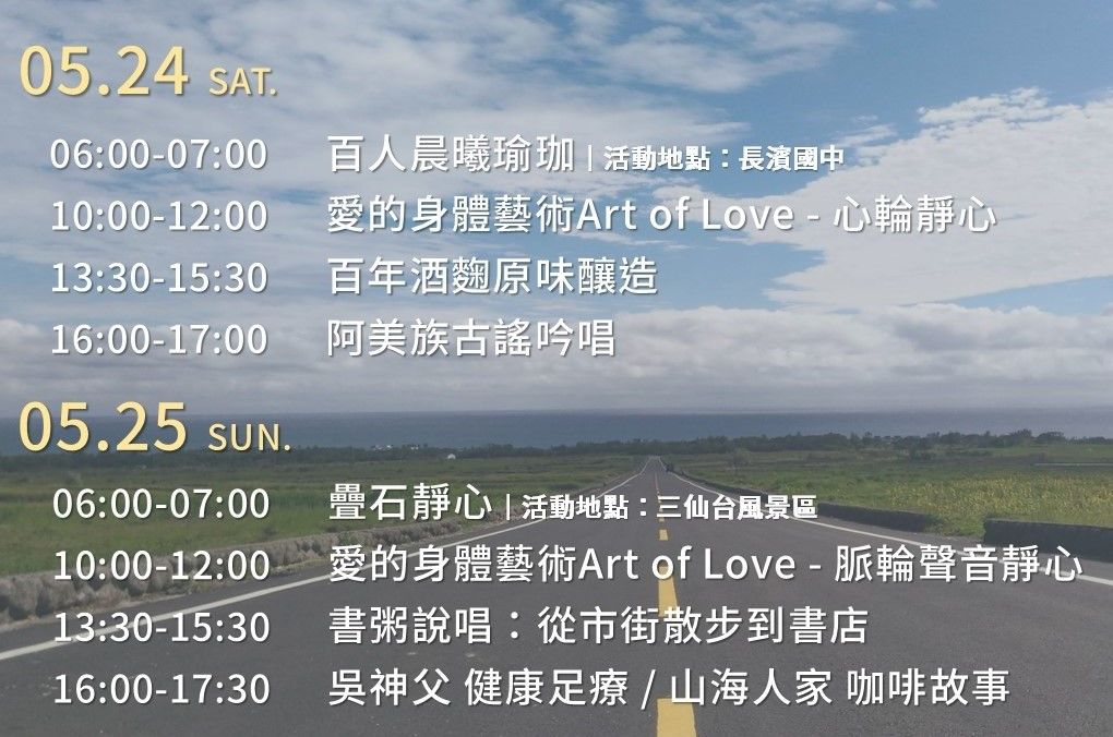 臺東縣政府以臺東獨具的山海、文化與慢活氛圍為基礎,打造獨具特色的身心靈休閒品牌《自然醒慢活祭》,今年將於5月24、25日(六、日)在長濱鄉運動公園舉辦兩日限定的「淨心慢旅行」活動,邀請民眾在依山傍海的環境中放慢腳步,透過靜心體驗重新連結內在節奏,找回生活的感知與美好。活動結合瑜珈靜心、阿美族文化體驗、市街走讀與健康足療,打造一場療癒感十足的深度旅程,絕對是春末初夏不可錯過的慢活盛事。
