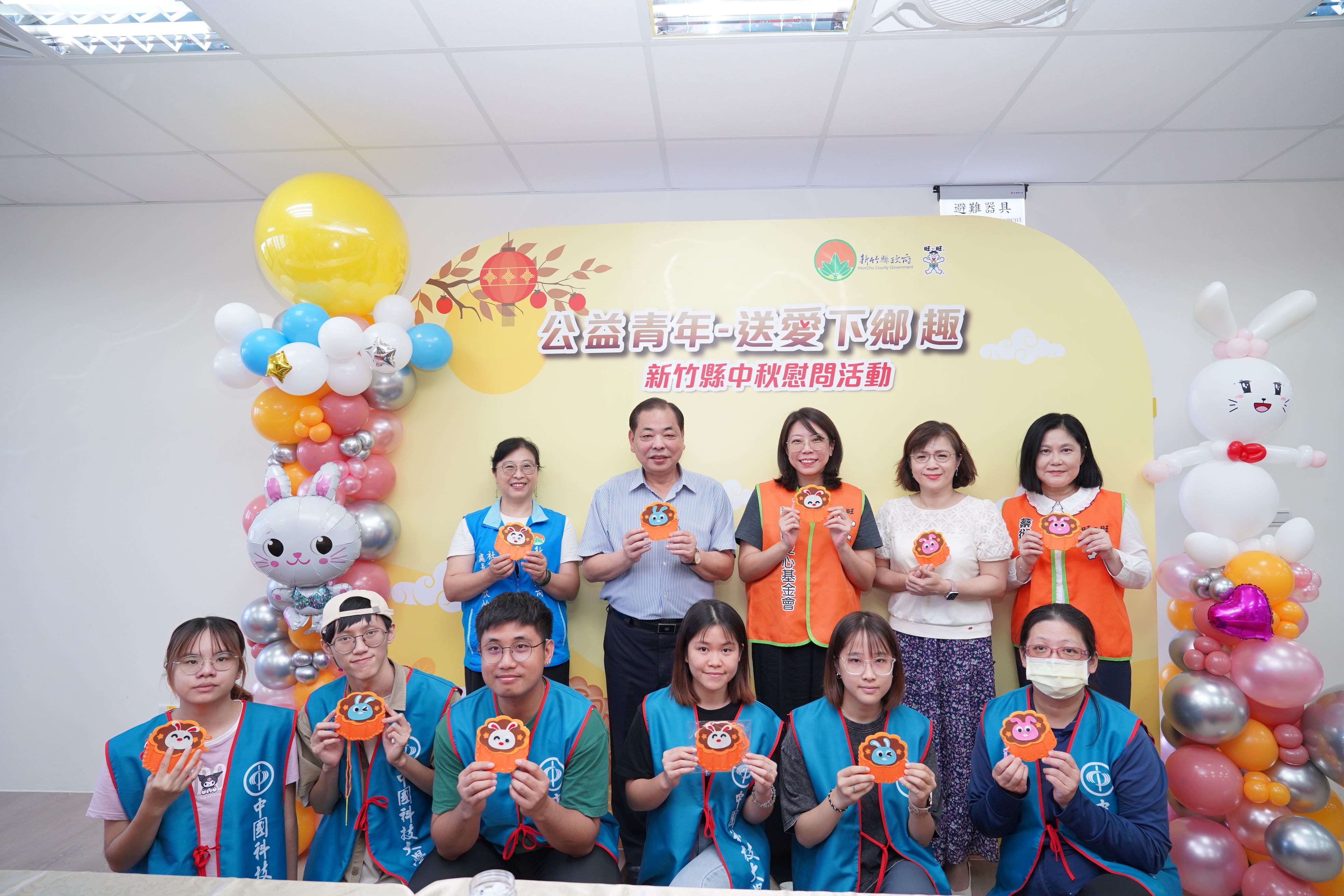 新竹縣政府關懷縣轄弱勢家庭,在中秋佳節前夕攜手財團法人蔡衍明愛心基金會及中國科技大學的師生,於今(24)日上午在竹北市民活動中心共同舉辦「公益青年-送愛下鄉趣」2025新竹縣中秋節慰問活動,副縣長陳見賢頒贈在地伴手禮給6戶代表出席的鄉親,基金會董事長蔡紹云也親自發送每戶5千元的中秋慰問紅包,中國科技大學師生帶領受贈代表及來賓一起手作象徵團圓與幸福的「月餅錢袋」,場面溫馨。