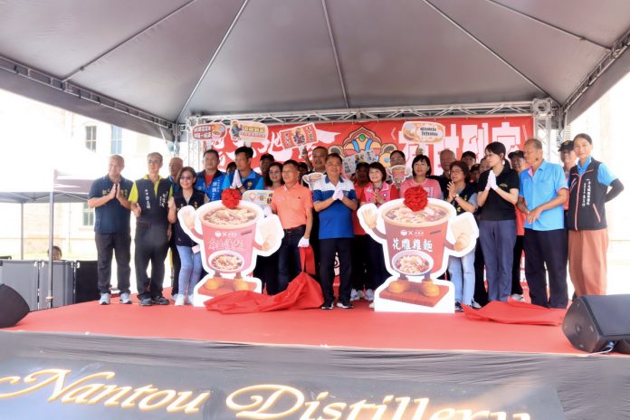 張市長(左起)吳主委廖鄉長與謝副廠長都歡迎大眾訪酒廠 與吃泡麵。(記者扶小萍攝)