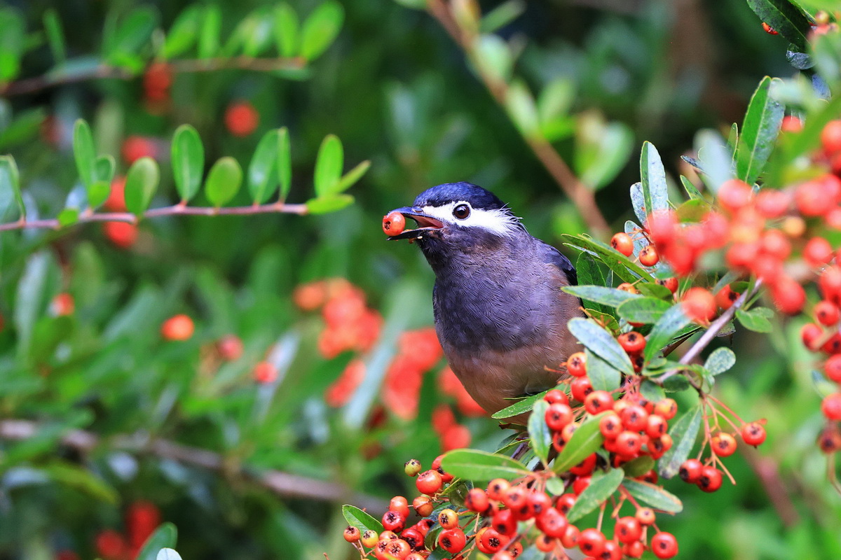 從盛暑邁入初秋的10月,杉林溪結滿枝頭的紅果吸引了大批的鳥類前來覓食,依然吸引大批愛好攝影的朋友來朝聖。眾多鳥類齊聚,活潑跳躍穿梭於枝葉間,大啖著數不勝數的鮮紅果實,隨時可見到成群歡樂嘻鬧的冠羽畫眉叫聲、白耳畫眉在枝葉間大快朵頤、難得見到的紋翼畫眉也成為鏡頭裡的最佳模特兒;園區儼然成為山鳥的露天餐廳,進行著鳥類的流水席。