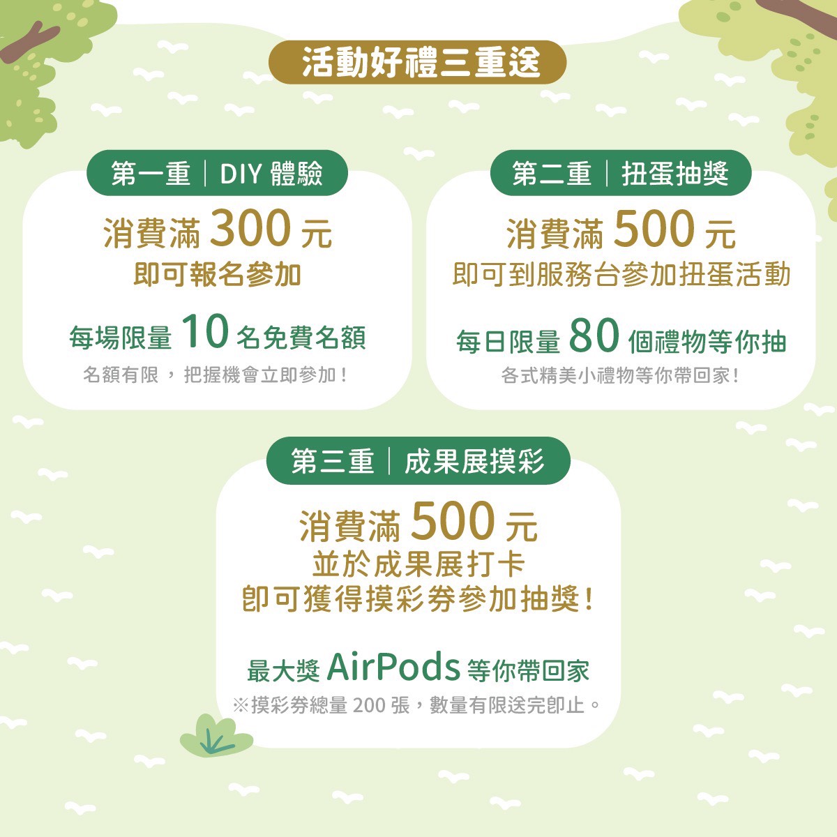 3、消費滿500元,並於成果展拍照打卡,即可參加抽獎。