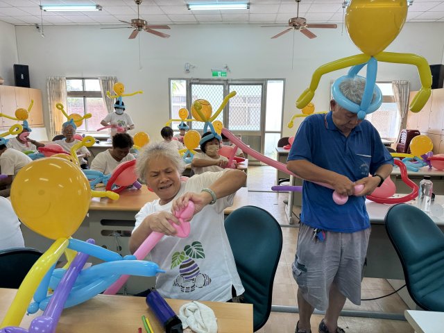 課程內容涵蓋氣球種類介紹、打氣與綁結技巧,並進一步實作氣球花朵、頭飾及創意造型串飾等作品。氣球造型創作過程中,不時有氣球不小心爆破,學員尖叫聲不斷,開心無限;透過實作教學與團體互動,不僅提升長輩的手眼協調能力,更激發創意思考與參與動機,有效增進學員之間的情感交流與成就感。