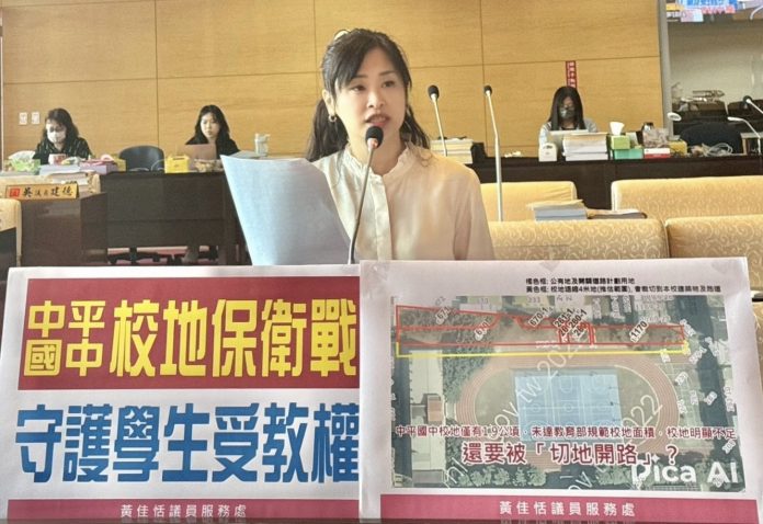 台中市議會21日進行教育文化質詢,黃佳恬議員為中平國中7百多名師生請命。中平國中校地僅有1.9公頃,本就空間狹小、活動空間嚴重不足,現在竟然還要被「切地開路」?引發師生與家長強烈反彈,嚴重影響孩子的受教權。