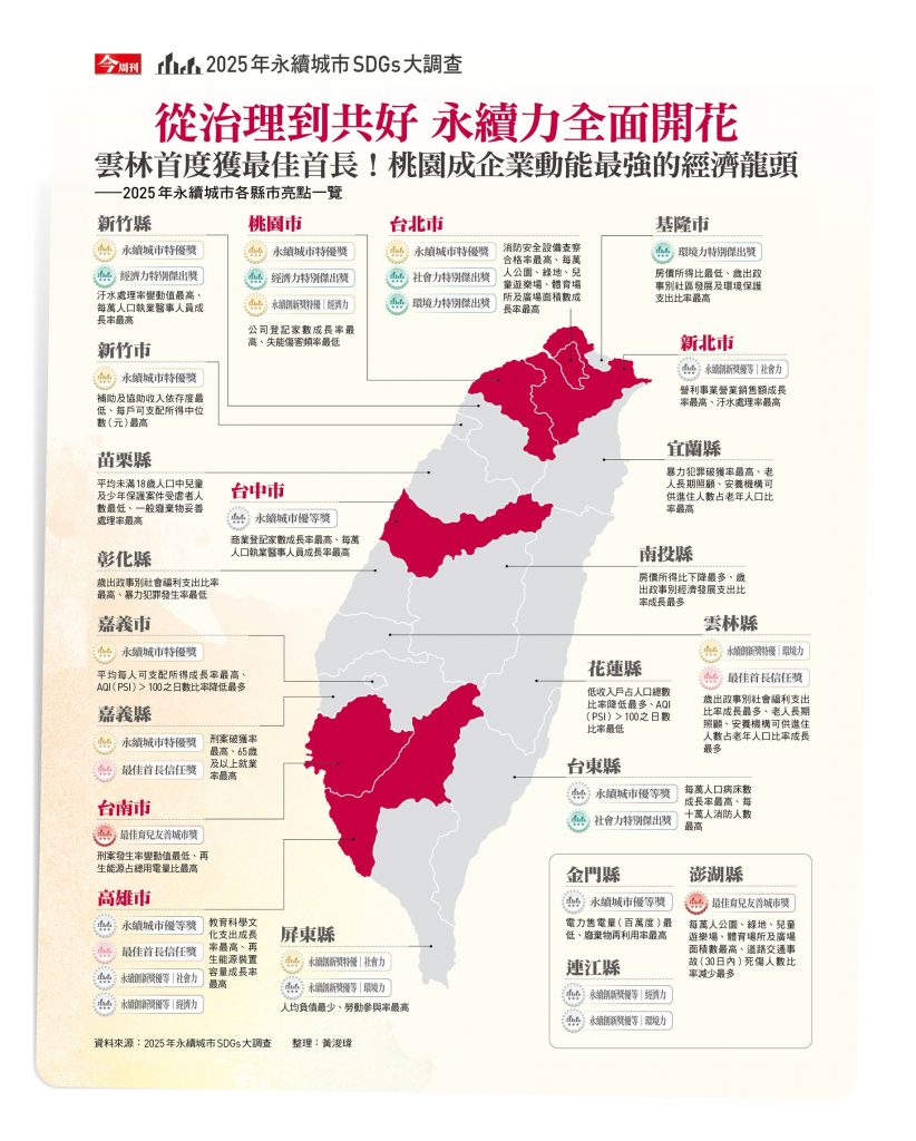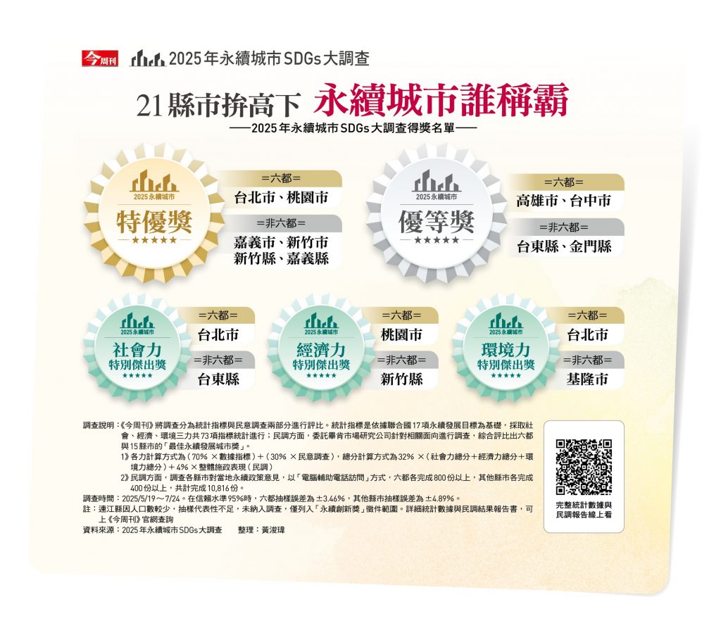 今周刊主辦「2025永續城市SDGs大調查」,嘉義縣首度奪下「永續城市特優獎」,縣長翁章梁更獲得5連霸「最佳首長信任獎」。翁縣長今(22)日出席頒獎典禮,感謝鄉親支持與縣府團隊的努力。