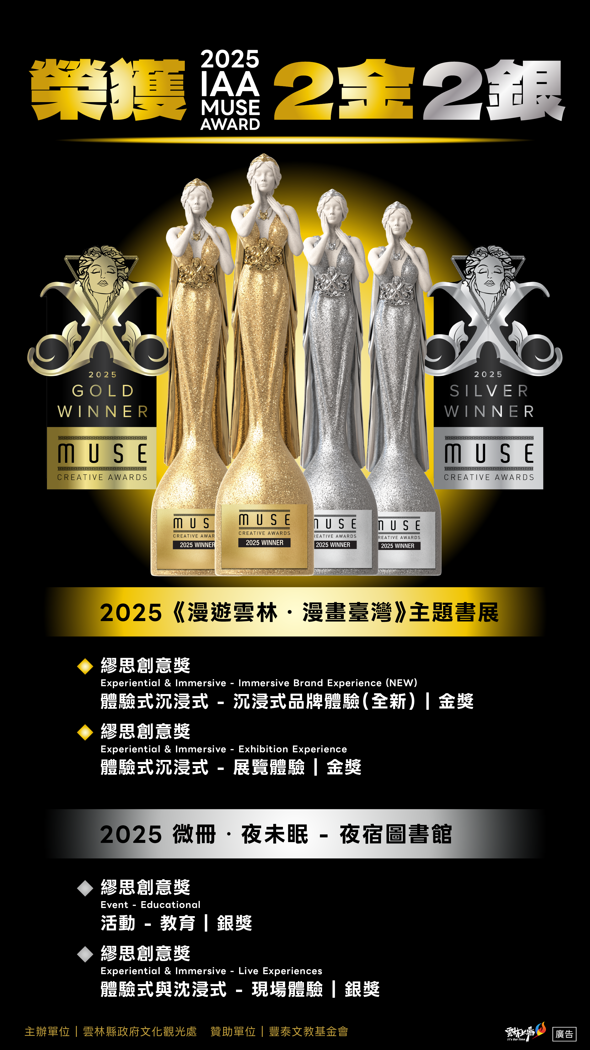 「漫遊雲林・漫畫臺灣」主題書展以沉浸式互動體驗為核心,結合在地漫畫創作、閱讀推廣與文化美學,打造「漫畫沉浸式閱讀體驗空間」,讓民眾透過圖像與故事,重新發現雲林的土地記憶與人文魅力。該展以創新策展思維與卓越體驗設計,一舉榮獲繆思創意獎「 展覽體驗」、「沉浸式品牌體驗」雙金獎;此外,兼具教育意義與親子共讀樂趣的「微冊夜未眠・夜宿圖書館」活動,透過閱讀、遊戲、音樂與夜宿活動,結合在地藝術能量、跨界合作與教育設計,打造兼具藝術性、互動性與教育性的文化體驗,榮獲繆思創意獎「教育」、「現場體驗」雙銀獎。