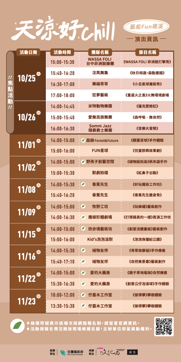 宜蘭縣政府文化局自10月25日至11月23日每週六、日下午在礁溪跑馬古道公園(北園區)舉辦【藝起Fun礁溪-天涼好Chill】系列活動。活動內容豐富多元,結合專業團隊展演、美感手作及互動體驗,邀請民眾透過親子共遊、藝術欣賞與生活美學體驗,共享美好的秋日午後時光。