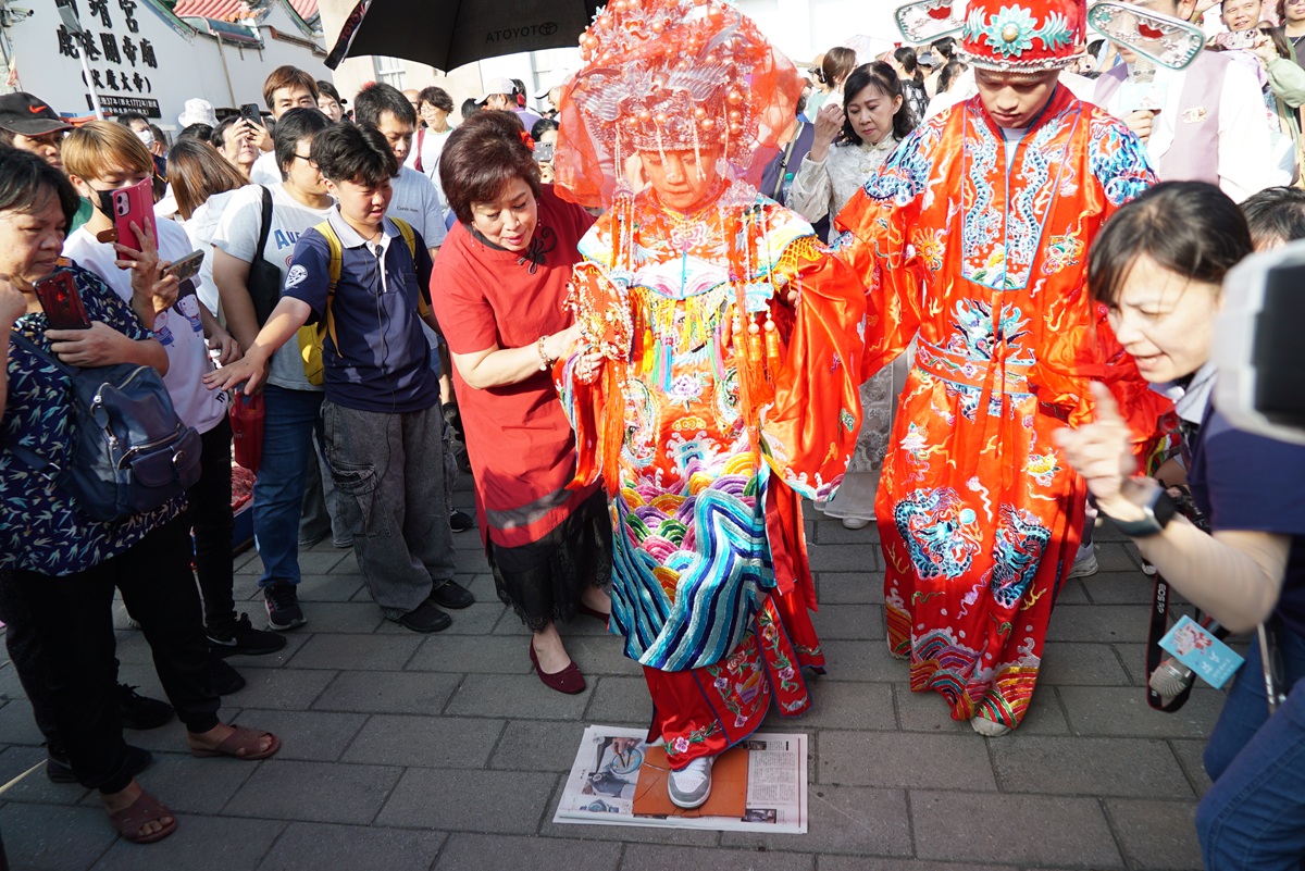迎親隊伍沿途發送喜糖,與民眾共享新婚喜悅,並完整重現早期婚嫁儀式中的「十二禮」,包括金香燭炮、聘金、項鍊、戒指、龍眼、冬瓜、喜餅、喜糖、酒等,讓參與民眾及遊客彷彿穿越時空,深度體驗臺灣傳統婚俗文化的魅力。
