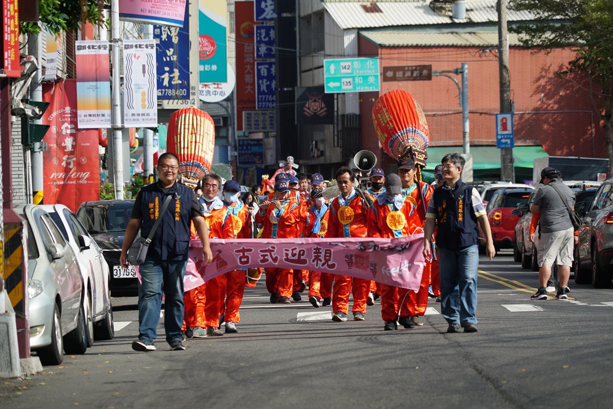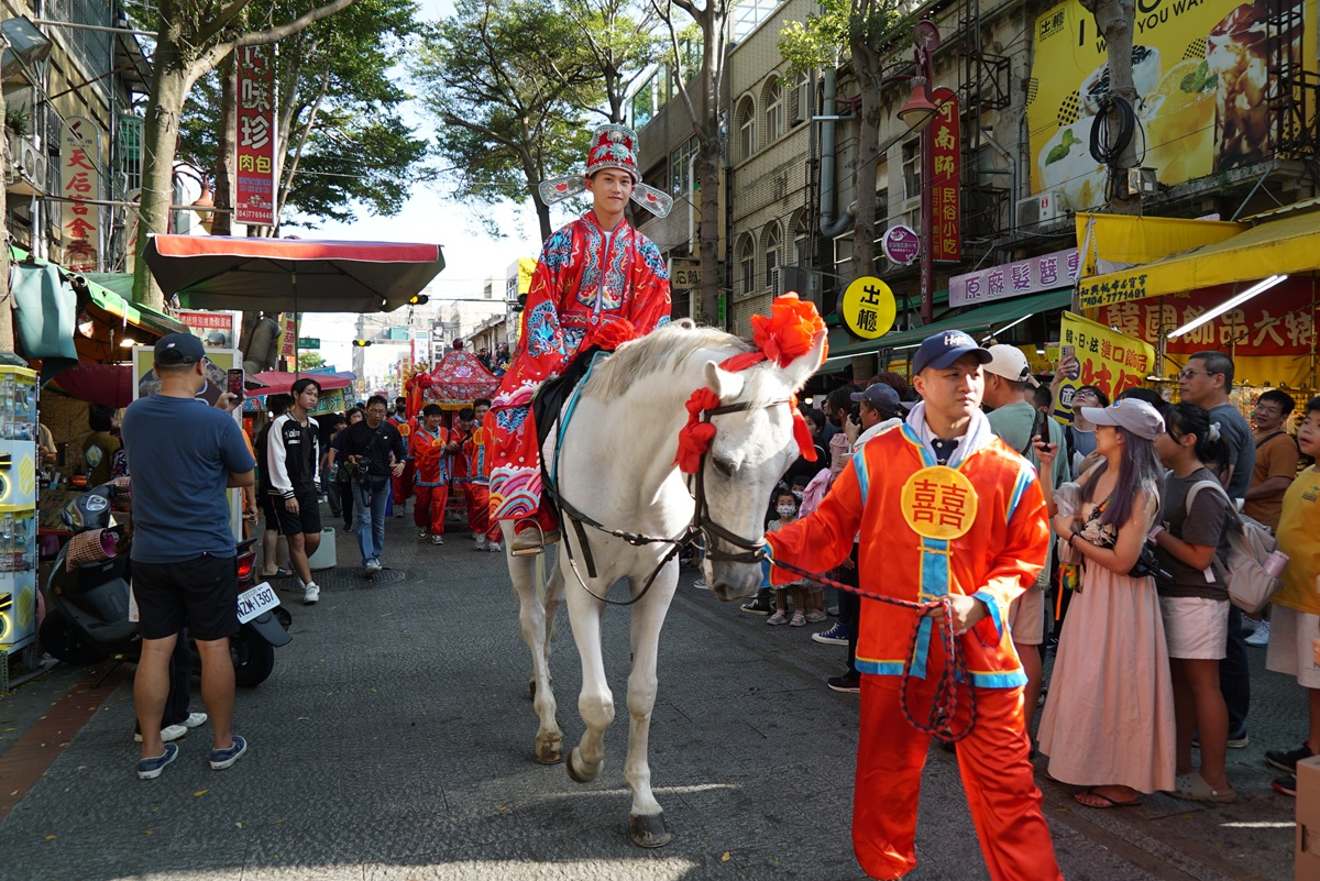 一年一度最具代表性的「四季紅~秋收系列活動」於今(25)日在鹿港文武廟熱鬧揭開序幕,融合傳統與文化底蘊的「古式婚禮迎親」活動,由新郎騎著白馬、引領著新娘乘坐的花轎,浩浩蕩蕩地踩街迎親前往公會堂,沿途鑼鼓喧天,重現早期台灣婚禮的隆重與喜氣,吸引大批民眾駐足欣賞,爭相拍照打卡,洋溢著濃厚的喜慶氛圍。