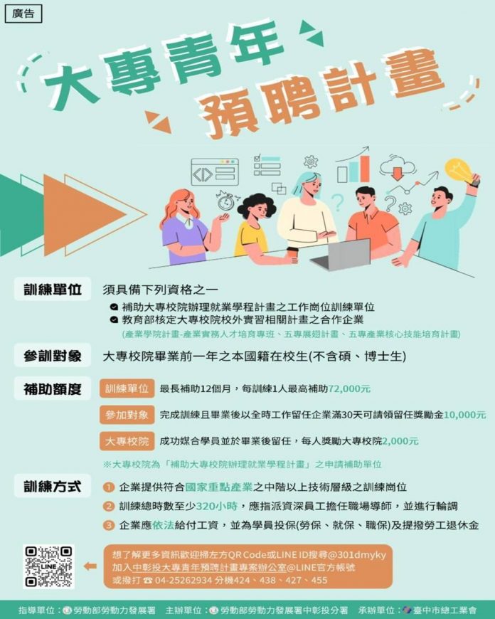 中彰投分署表示,企業參與「大專青年預聘計畫」,不僅能獲得政府補助,更能提前布局人才戰略,在競爭激烈的市場中搶得先機。凡企業願意提供大專院校畢業前一年學生實務訓練機會,最長可獲12個月、每人最高7.2萬元的訓練補助。學員完成訓練並於畢業後留任滿30天,也能申請1萬元留任獎勵金。除生技醫療領域外,也涵蓋智慧機械、亞洲矽谷、綠能科技、循環經濟、5G及資安卓越等重點產業。企業欲瞭解更多計畫資訊,可洽中彰投分署(04)2359-2181分機1523陳先生。