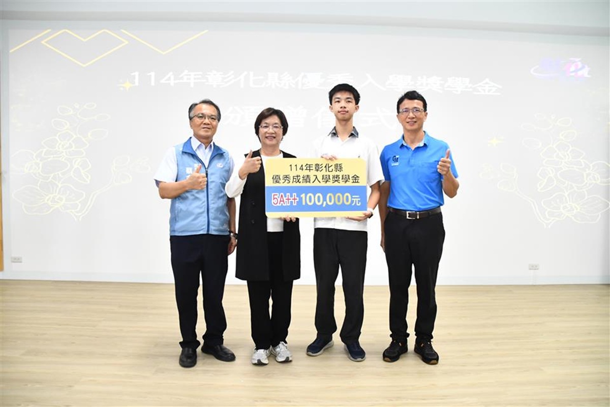 彰化縣政府今(31)日上午於和美高中舉辦「114年度國中會考優異學生獎學金頒贈典禮」,由縣長王惠美親自頒發73萬元獎學金給23位優秀學子。王縣長表示,114學年度共有23名學生符合申請資格,其中5A++(10萬元)1名、5A(5萬元)3名、4A1B(3萬元)10名、3A2B(2萬元)9名,相較去年18位受獎學生增加5位,顯見成功吸引更多優秀學子選擇縣立高中就讀,未來也期盼逐步提升本地升學比例。