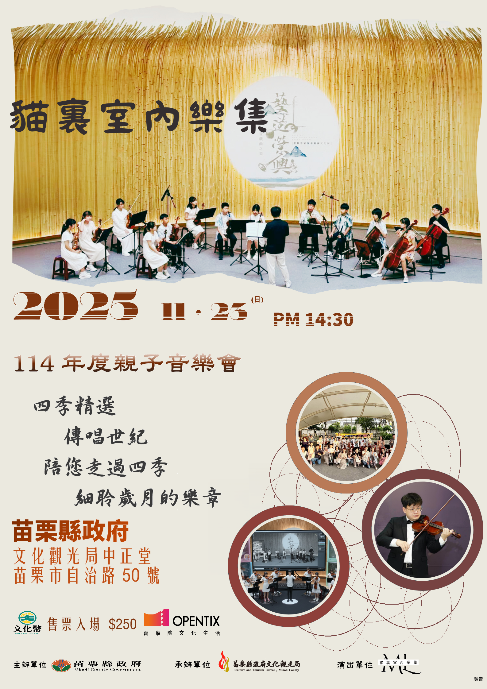 用音樂串起親子間的幸福時光!由貓裏室內樂集精心策劃的「114年度貓裏室內樂集親子音樂會」,將於 11月23日(星期日)下午2時30分,在苗栗縣政府文化觀光局中正堂演藝廳隆重登場。票價250元,即日起於Opentix售票系統熱賣中,另配合文化幣青年席位政策,提供超值優惠。