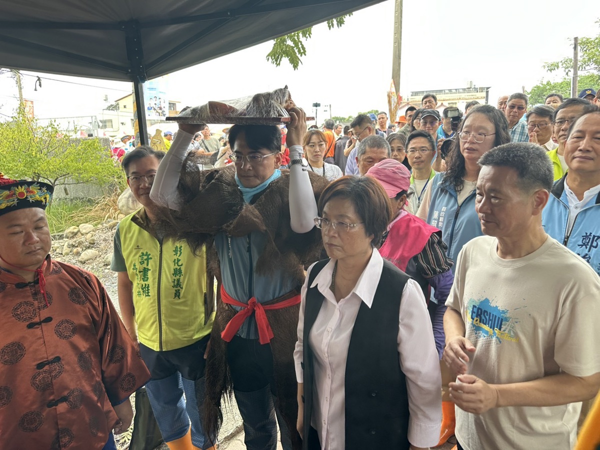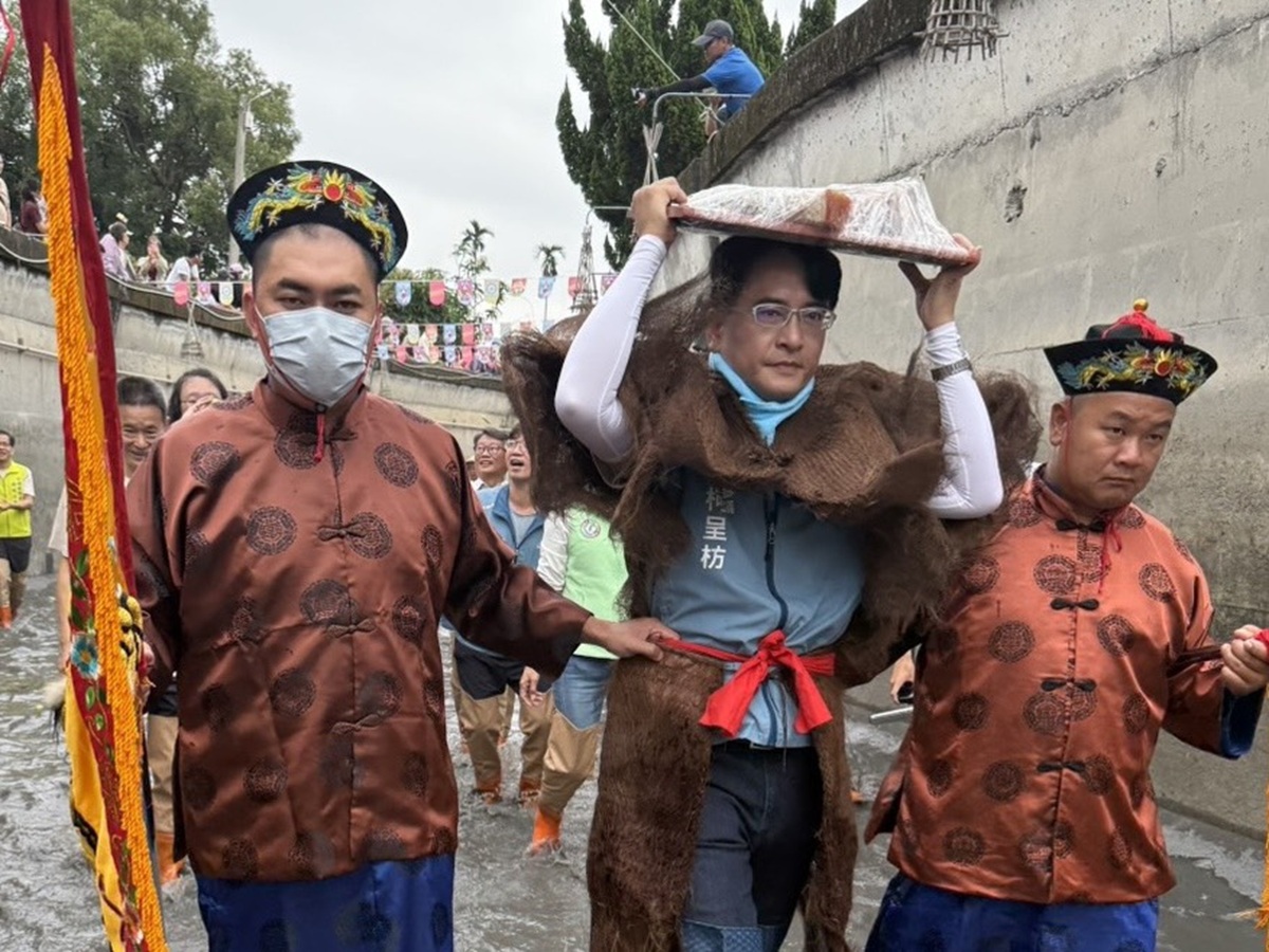 一年一度的「八堡圳跑水節」今日熱鬧登場,其中重要的「引水」儀式重現清康熙年間開圳的歷史場景,其中最具象徵意義的「簑衣引水人」角色,今年由柯呈枋擔任。他頭綁紅巾、身披簑衣、腳踏草鞋、頂著牲禮,親自下水領隊開閘放流,帶領跑水隊伍完成儀式,展現對地方水利文化的敬意與傳承決心。