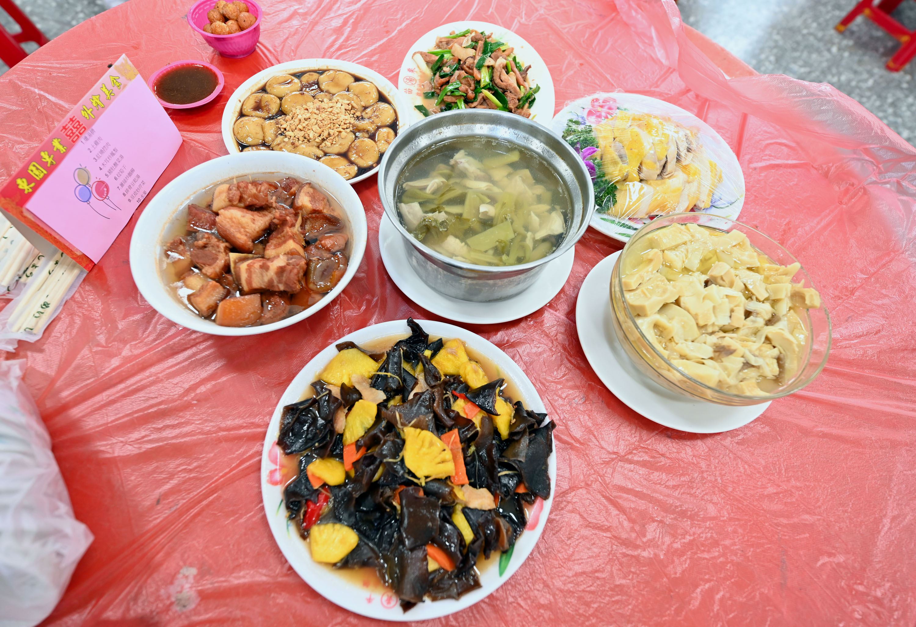 「炆」指的是以慢火將食材烹熟煮軟,「炒」則用熱油爆炒菜餚,各有風味。四炆包括酸菜炆豬肚、炆爌肉、排骨炆菜頭、肥湯炆筍乾;四炒則為客家小炒、豬腸炒薑絲、鴨血炒韭菜、俗稱「鹹酸甜」的豬肺鳳梨炒木耳。烹調與菜色絕不鋪張奢華,卻是色、香、味俱全,今天還外加客家甜點「熝湯糍」和「剁雞盤」,可說是客家料理的滿漢全席。