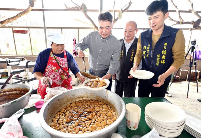 苗栗縣公館鄉婦女會今天在館南村活動中心舉辦客家傳統四炆四炒烹調研習活動,共有25桌鄉親熱情參與。縣長鍾東錦、夫人陳美琦中午也到場一起品嘗道地的客家佳餚,鍾東錦還幫忙盛甜點「熝湯糍(牛汶水)」,讓大家吃得津津有味,也重現出農業社會客家庄辦桌「打逗敘」的熱鬧氣氛。