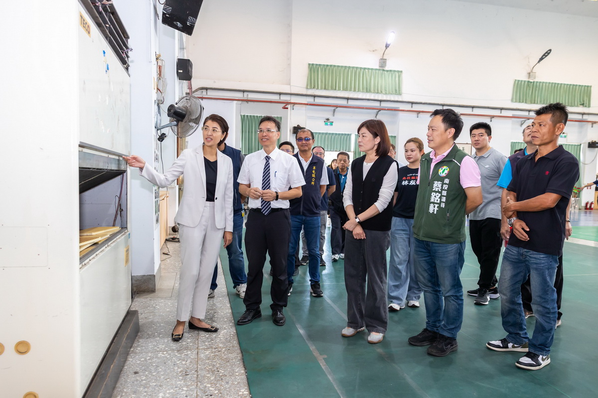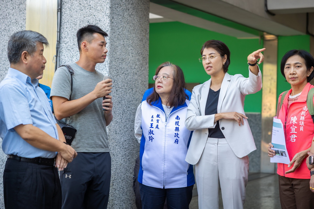 國姓國中校長陳啟濃向許縣長、縣議員陳宜君、國姓鄉長邱美玲說明,學校自九二一地震重建後至今已20多年,每逢夏季午後下雨,便有多處走廊、室內空間淹水,辦公室及教室天花板也嚴重滲水,不僅師生使用不便,也怕發生意外,希望能施工改善。