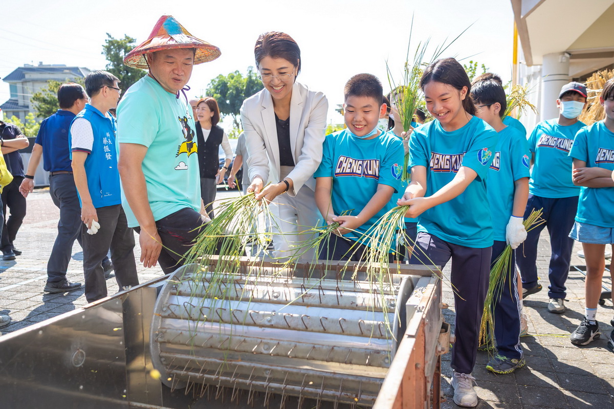 許縣長抵達北投國小時,正好遇到台中的學校參訪,她與學生一同使用水稻脫穀機體驗水稻脫穀。校長陳文燦說,校內球場除了國小及幼兒園體育課、平時開放給社區居民運動,直排輪、跳繩隊、巧固球隊及校慶運動會、母親節藝文晚會也都會使用,球場從民國84年啟用、99年整修使用迄今,因長期使用及日曬雨淋,場地隆起、積水、破損嚴重,希望整修及規劃為籃球、排球、巧固球皆能使用的綜合球場。