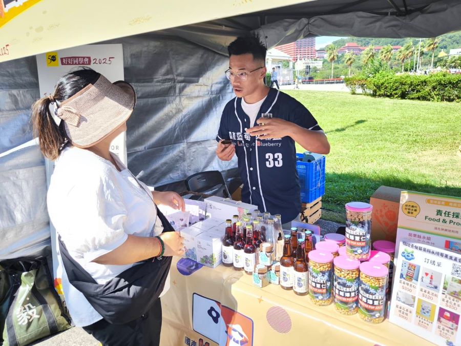 活動現場以「國產藍莓大聯盟(MLB)」主題攤位為亮點,展出多款藍莓系列商品,包括藍莓果茶、爆薏仁、氣泡飲、啤酒及果凍條,呈現青農創意與產地能量。現場凡入場參與活動的民眾皆可品飲到藍莓氣泡飲,在果香氣泡間感受國產藍莓的清爽風味與天然香氣。活動同時結合抽獎互動,提供「天茶地酒」認證的安貝斯梅酒作為禮品,讓民眾有機會透過地酒品嚐到臺灣風土滋味,同時也提升活動熱度與參與樂趣。