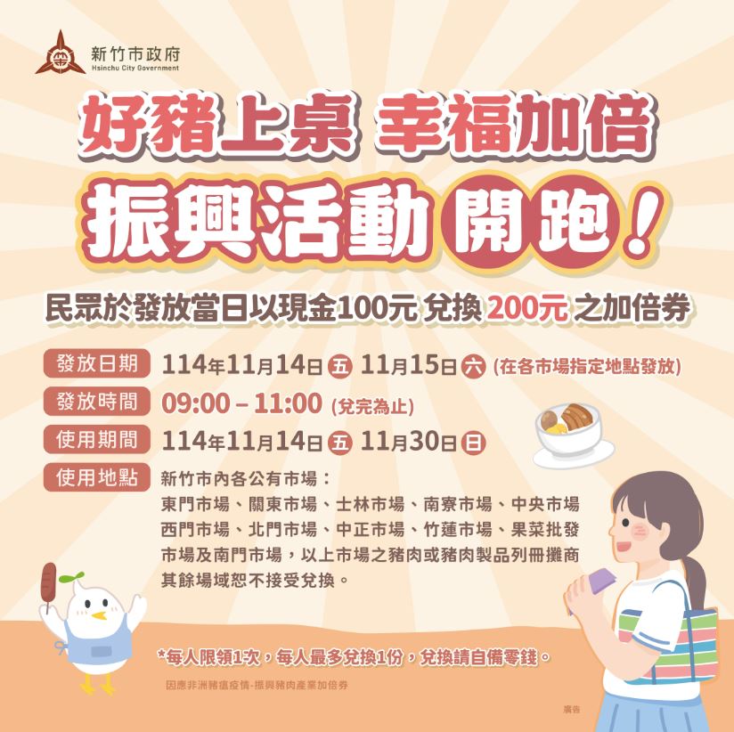 全國非洲豬瘟疫情獲得控制後,為鼓勵市民選購在地豬肉並帶動豬肉產品買氣,新竹市政府今(14)日於10處公有市場同步啟動「好豬上桌 幸福加倍」振興活動,推出「100元換200元」的振興豬肉產業加倍券。活動首日即吸引大批市民踴躍排隊兌換,現場氣氛熱絡,豬肉攤商也普遍反映買氣明顯回升。