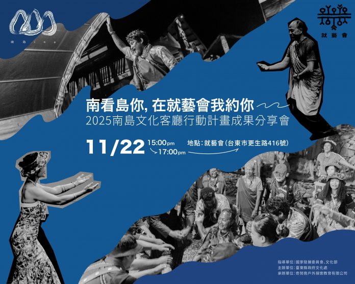 臺東縣政府推動的「2025南島文化客廳行動計畫」,即將於11月22日(六)下午3點在就藝會舉辦成果分享會,邀集在地文化團隊、藝術家及國內外合作夥伴齊聚一堂,回顧一年來的交流歷程與行動成果。