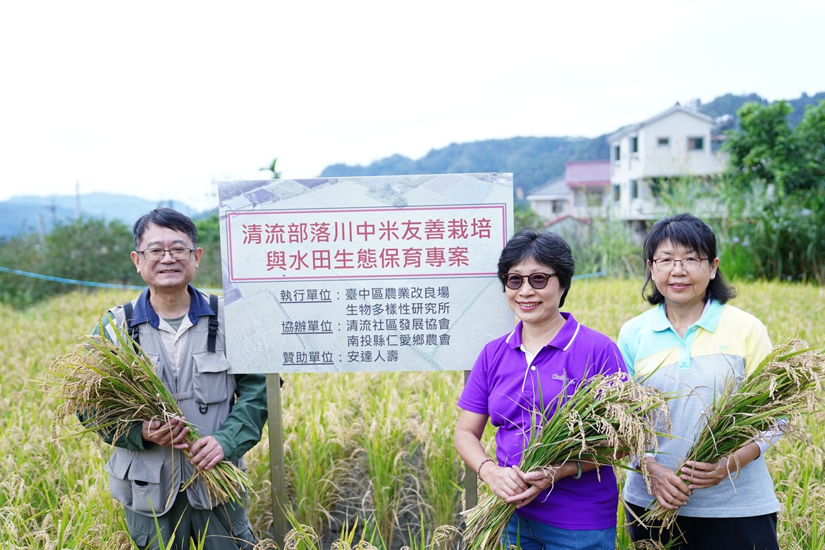 臺中農改場進一步說明,本年度的合作更納入生物多樣性研究所的資源,擴大跨域合作效益,生多所參與本專案的水田生態保育提供堅實的農地生態基礎資料,透過鳥類棲架的營造與生物資源的盤點,發現當地有豐富的蝶類、鳥類及哺乳類於水田環境共榮共存,後續將持續推動棲地營造與生態推廣。安達國際人壽則是繼110年贊助該場進行之「伊娜谷香糯米保種計畫」後,持續於今年贊助「清流部落川中米友善栽培與水田生態保育專案」,實踐企業社會責任並投入原鄉部落農業的永續創生。本次活動亦結合「由農田到餐桌」與「生態農業」的食農教育課程,邀請仁愛鄉互助國小師生共同參與,體驗「小小生態調查員」、田間割稻、米飯品評及飯糰製作等豐富有趣的活動,透過實作讓部落學童親近土地、理解稻作文化,進而對在地川中米產業留下難忘而深刻的印象。