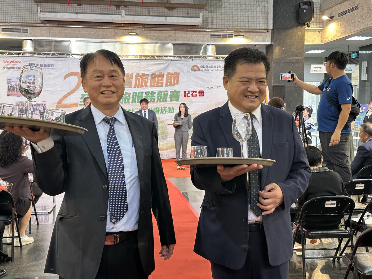 南投縣旅館商業同業公會26日在縣府一樓大廳舉辦賽前記者會,由縣府代理秘書長簡青松、交通部觀光署日管處副處長湯維堯及旅館公會理事長暨日月潭觀光圈聯盟盟主李吉田共同主持,與南開科大同學一同體驗拖盤走秀,為全國最具指標性的餐旅技能盛會揭開序幕。