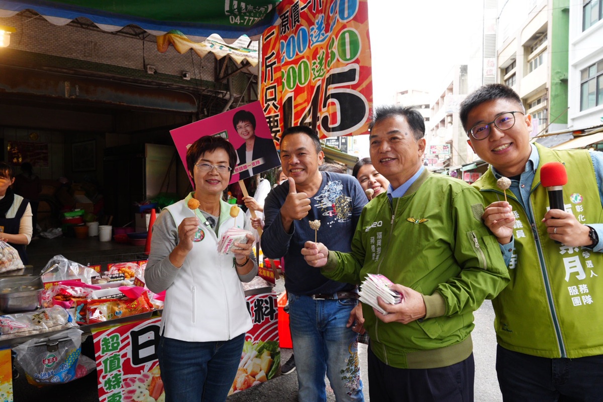 民進黨彰化縣長擬參選人陳素月今(27)日上午前往鹿港第一市場掃街拜票,福興鄉長蔣煙燈、議員藍駿宇、劉珊伶、張欣倩等人陪同,一行人向攤商與民眾爭取12月15日至18日接到電話民調「唯一支持陳素月」。掃街過程中,陳素月多次聽到民眾熱情加油,讓她直呼相當感動。