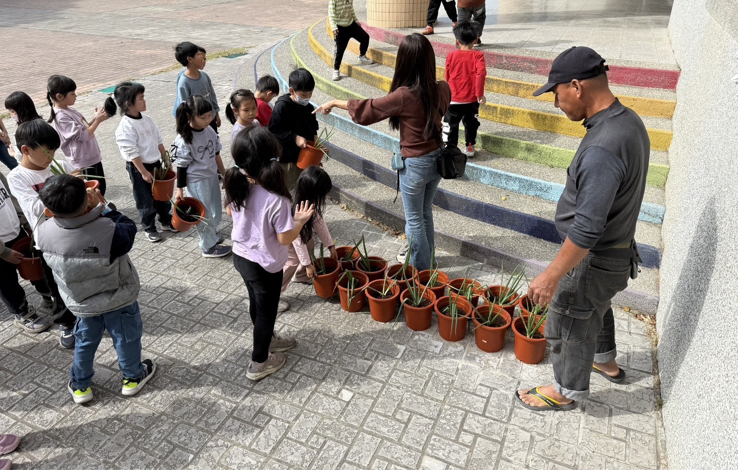 洪期文班長於活動開始,先向小朋友介紹粉蔥的外型、成長特性與用途,再比較蔥、蒜、韭菜的不同,引導孩子從視覺、嗅覺與觸覺認識作物。小朋友們反應熱烈,不僅專注聆聽,也不時舉手提問,教室裡充滿探索與好奇,學習氛圍生動活潑。接著進入最受期待的種植體驗環節。洪班長示範粉?的栽植方法,包括盆器深度、覆土技巧、水分管理與日常照護重點,讓孩子了解蔥苗如何從土壤中慢慢長大。為讓活動更順利進行,特別邀請臺中市青農聯誼會大安分會會長黃益豪、會計楊靜瑀及會員黃紀為到場協助。青農們在現場手把手指導,每位孩子都在青農與老師們的陪伴下,完成自己的「第一盆粉蔥」。