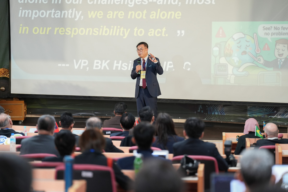 副總統蕭美琴在開幕典禮中以錄影方式致詞,對本次年會表達高度肯定。她表示,大學在面對氣候變遷時扮演關鍵角色,不僅是知識領航者,也是社會淨零轉型的核心引擎。台灣學界長期投身綠色科技、能源轉型及永續研究,已展現堅定的國際承諾。政府將持續深化國際合作,強化跨域研究與人才培育,並期望透過此次會議深化全球交流,把理念化為具體行動。