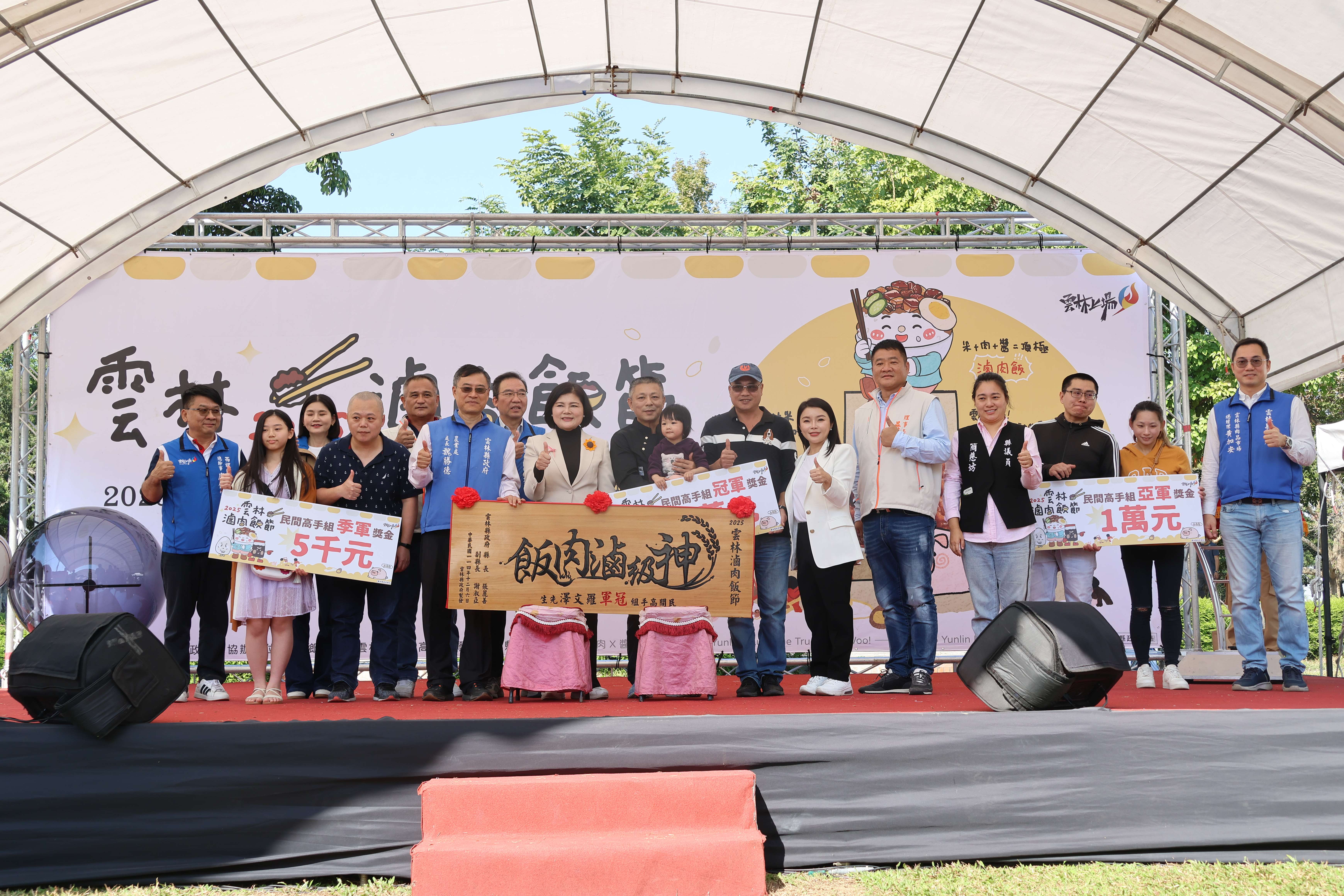 張縣長說,最受矚目的神級滷肉飯爭霸戰結果也於今日揭曉,專業店家組由大崙發哥麵店獲得本屆冠軍殊榮,民間高手組冠軍則由來自台北市的羅文澤先生獲得,現場頒發冠軍匾額及獎金;感謝食材贊助廠商包含米、醬油-西螺鎮農會、肉-雲林縣肉品市場,提供雲林最優質的米、醬、豬肉,滷肉飯的靈魂三元素,歡迎全國的民眾尋香到雲林,細細體會雲林「神級滷肉飯」的好滋味及在地食材的好品質。