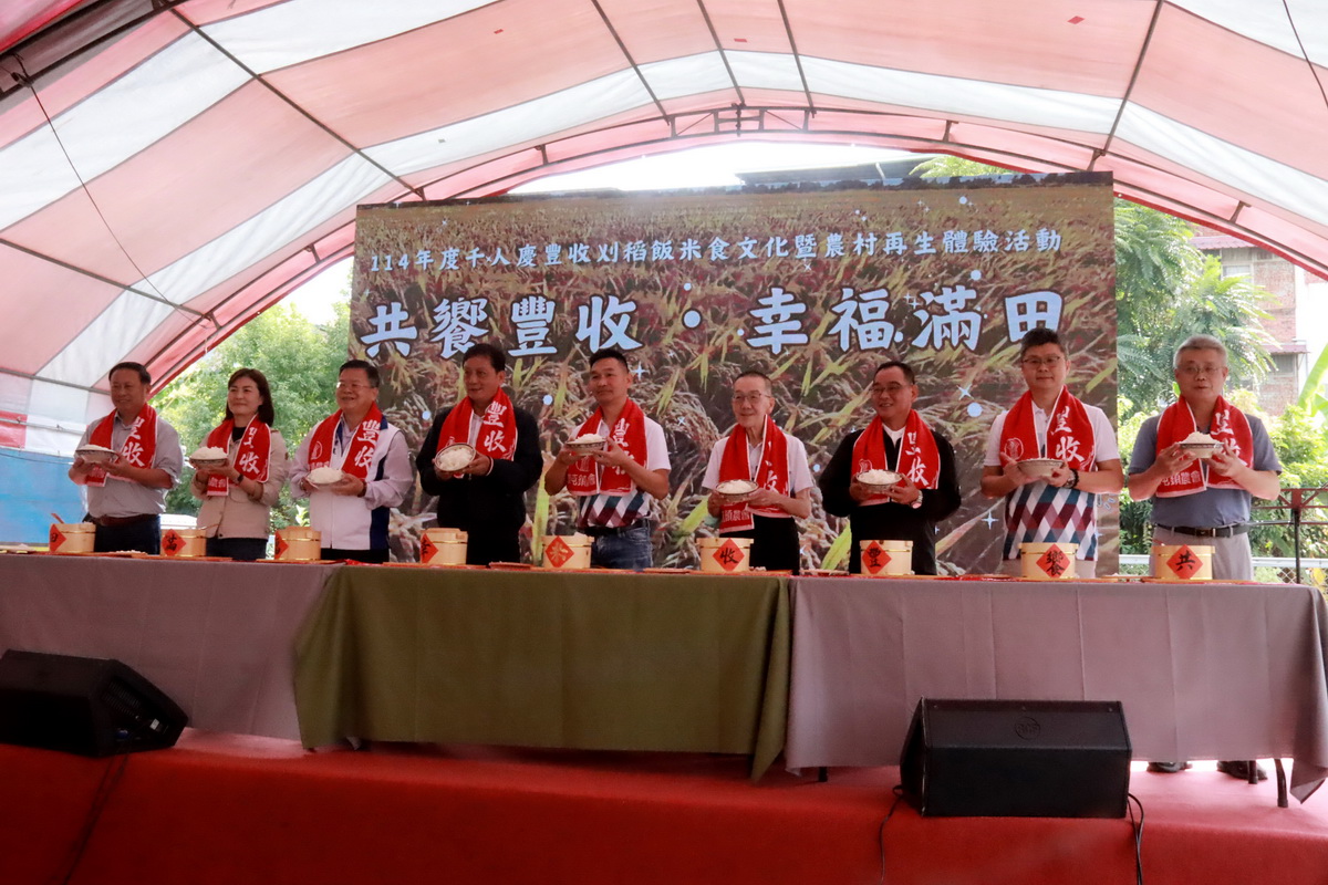 南投縣草屯鎮年度最富文化深度與人情味的農村盛會,由農糧署、農村發展及水土保持署、中區分署、南投縣府與草屯鎮農會共同舉辦的「共饗豐收・幸福滿田」千人慶豐收割稻飯米食文化活動,13日在敦和宮大型停車場隆重登場。這項盛會不僅慶祝水稻豐收,更是農會推動「富麗、安康、永續」政策的重要成果展現。
