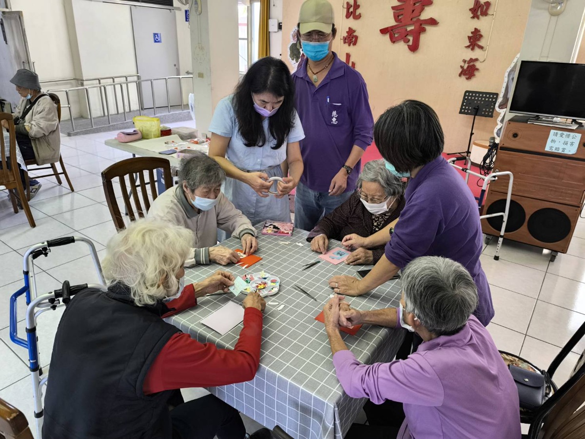 埔榮個管師余金英表示,透過多元的非藥物治療方式,包含藝術創作、感官刺激及人際交流,協助長者維持認知功能並提升生活活力。活動中,住民們以色紙、乾燥花材、貼紙等素材,用心打造專屬的聖誕祝福花卡與小禮盒,現場洋溢專注、愉悅與溫馨的氛圍。