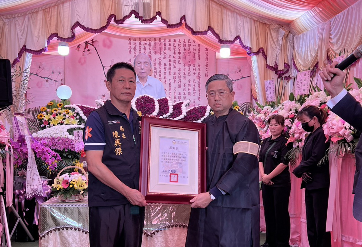 18日下午消防局長陳興傑代表縣長許淑華前往參與林六壹先生的公祭,回贈感謝狀向捐贈者致上最崇高的謝意,並由家屬林宏誠代表接受感謝狀。陳局長指出老先生住草屯鎮,生前曾因身體不適,數度由草屯分隊員護送至醫院就醫,對消防人員的認真服務頗為感謝,其子遵循遺願捐贈三輛機車。