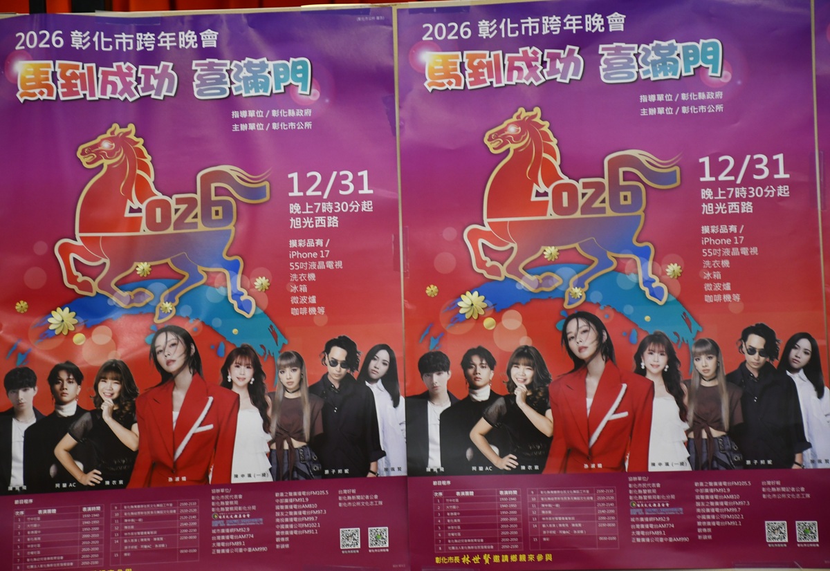 彰化市跨年晚會向來是年度盛事,也是吸引年輕族群共襄盛舉的重要活動。即便天氣寒冷,往年現場依然人潮滿滿、氣氛熱烈。今年卡司陣容更是堅強,邀請到陳竟飛、陳佩賢、阿蘭AC、原子邦尼、陳衣宸、陳申珮(ㄧ綾)等多組藝人接力演唱,炒熱現場氣氛;並由金曲歌后-孫淑媚陪伴大家一同倒數迎接2026年,勢必再度掀起跨年熱潮。林世賢市長也特別邀請全國各地朋友,一起到彰化與鄉親共度難忘的跨年夜。