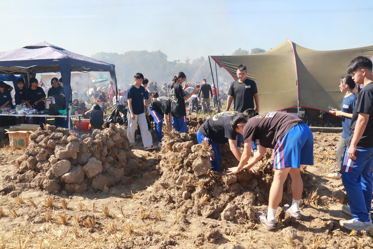 從上午堆窯、燒窯、破窯,北投朝陽宮二媽會贊助提供民眾品嚐在地美食饗宴,直至下午最期待的開窯時刻,在微風中民眾在焦紅暖烘烘的土堆旁大快朵頤吃著剛從土窯挖出熱騰騰、香噴噴的蕃薯、玉米、土雞蛋等人間美食,齒頰留香,溫暖每個人的心,別開生面的焢窯活動期望大家走出都市叢林,體驗古早農村生活文化,倘佯在藍天白雲稻田裏,共享親子田園休閒時光。