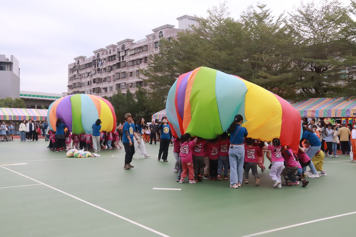 幼兒園氣球傘歡樂登場撐起大氣球。(記者扶小萍攝)