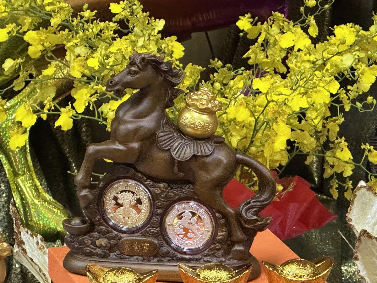金、銀錢母正面皆鑲嵌土地公聖像,祝福信眾全年平安順遂,另一面則是駿馬奔騰,並有馬到成功開新運祝詞。