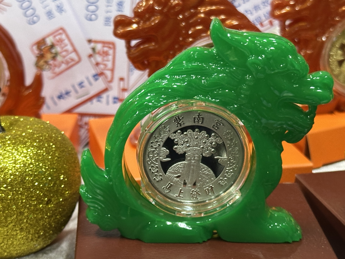 莊主委介紹今年的套組包裝討喜,也頗輕巧,主要看到就「馬上發財」。銅幣分別鍍上純金、純銀色澤,金色象徵富足、平安與貴氣,銀色則寓意財源流通、銀兩滿盈。馬年錢母圖騰以土地公聖像為主軸,搭配駿馬奔騰意象,並輔以聚寶盆於馬背,寓意「馬上發財、財運奔騰」。