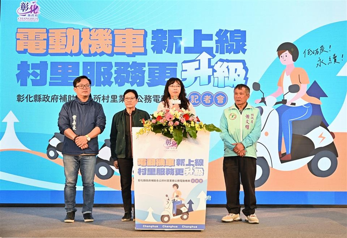 為提升村里服務效能,同時落實環境永續與淨零碳排目標,彰化縣政府29日上午於縣府中庭舉辦「電動機車新上線、村里服務更升級-彰化縣政府補助各公所村里業務公務電動機車記者會」,縣長王惠美表示,感謝議長謝典霖及所有議員對經費的支持,縣府推動各鄉鎮市公所電動機車補助計畫,公所可依地方特性及需求,採購村里業務公務電動機車,全縣共591村里,每輛補助上限6萬2,000元,總經費3,664萬2,000元,將低碳交通落實於各村里的公共服務。