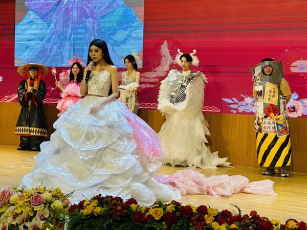 為了讓國際學生親身感受台灣年節的熱鬧與溫度,朝陽科技大學行銷與流通管理系特別舉辦跨年活動,吸引近500位來自越南、緬甸、印尼、蒙古、泰國及香港的國際學生與本地學生齊聚同歡,現場洋溢濃厚節慶氛圍。今年活動最大亮點為「永續時尚服裝設計走秀競賽」,國際學生以回收塑膠袋、寶特瓶、廢布料、舊枕頭棉絮、保麗龍、水果套袋、紙板與吸管等再生素材為創作媒材,透過分層堆疊與巧手縫製,打造出造型前衛、線條立體且質感輕盈的永續服飾,驚豔全場。