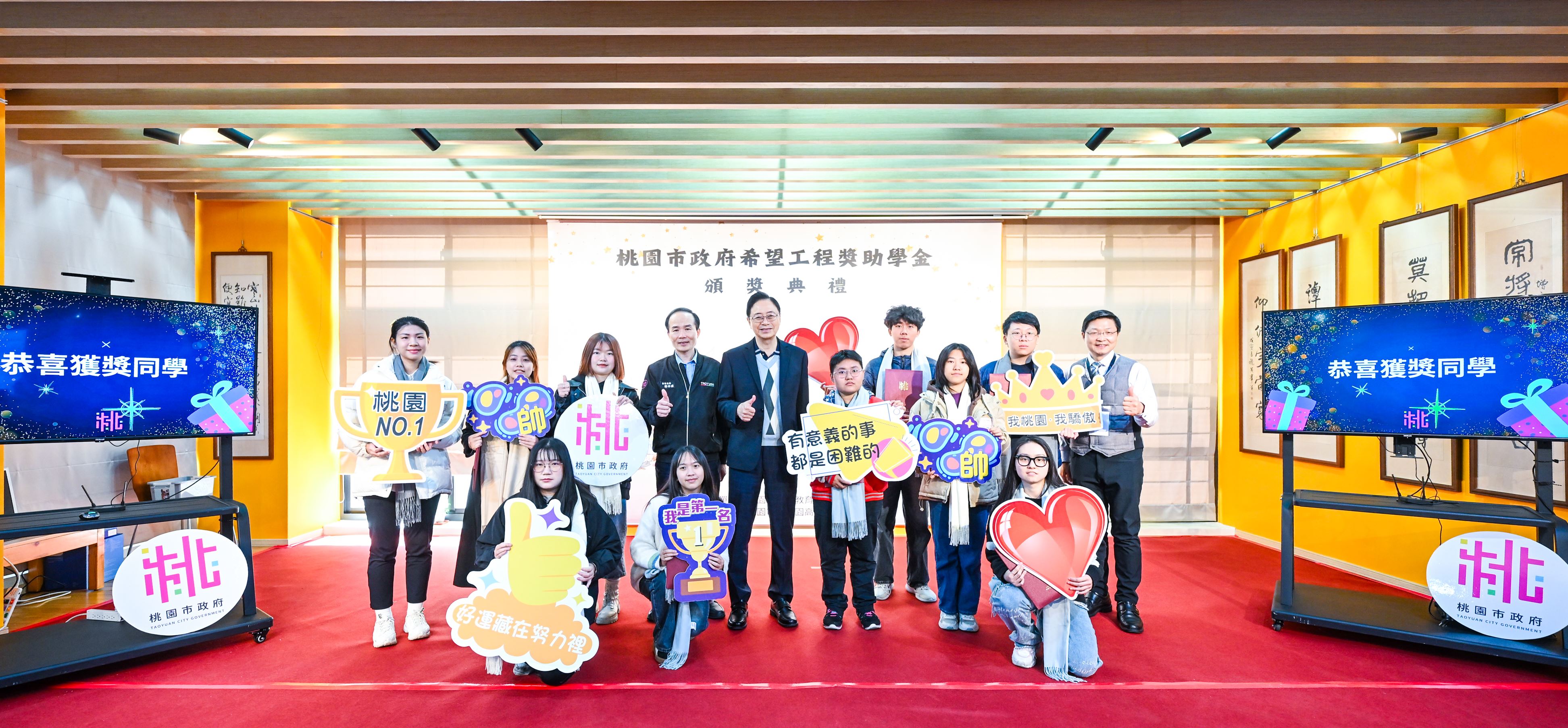 桃園市長張善政今(3)日上午前往桃園區,出席「114年度希望工程獎助學金頒獎典禮」。張市長表示,本次共21位高中及大專院校同學獲獎,此項獎助學金目的在扶助學業優異的經濟弱勢學生,期盼透過獎助學金的挹注,減輕生活經濟壓力,讓優秀學子能無後顧之憂地專注於學業,期許受獎同學持續努力,在學業及事業上皆有傑出表現,持續發揮互相支持與分享精神,為自己開創更寬廣的未來。