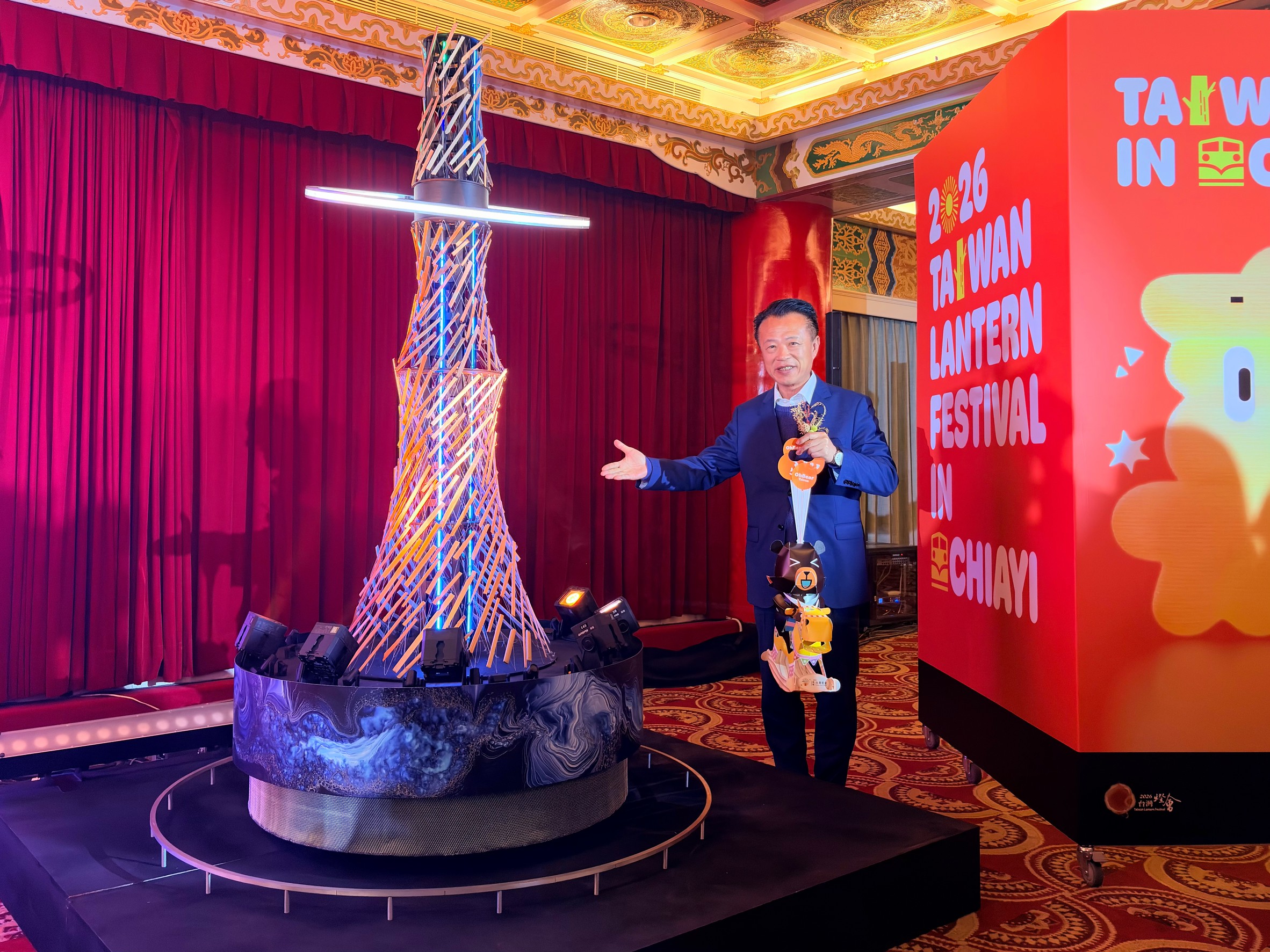 2026台灣燈會主燈「光沐—世界的阿里山」及小提燈「喔熊馬抵嘉」造型亮相!縣長翁章梁今(9)日赴圓山大飯店出席發表記者會,包括交通部次長林國顯、觀光署長陳玉秀及創作藝術家齊聚,熱烈歡迎全台遊客來嘉賞燈。