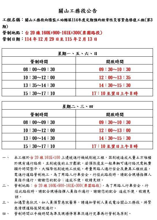 依公路局南區養護工程分局公告,臺20線南橫公路梅山口至向陽路段(臺20臨105線)目前實施有條件管制通行,自去(114)年12月起,每週週五至週一開放通行,週二、週三及週四全日管制封閉;開放日通行時間為每日上午7時至下午2時,並須於下午5時前離開管制路段。惟實際通行狀況仍將視天候、道路安全及災修情形滾動調整。此外,為提升道路通行安全,公路局南區養護工程分局關山工務段於臺東縣海端鄉臺20線161K+100(栗園路段)辦理上邊坡機械刷坡工程,自115年1月8日至115年2月13日止,每週一至週日上午8時至下午5時10分實施道路雙向管制。其中,每週一、五、六、日於上午8時至9時30分、10時30分至12時,下午1時35分至2時30分、3時30分至5時10分管制;每週二、三、四於上午8時至9時30分、10時30分至12時,下午1時至2時30分、3時30分至5時10分管制,其餘時段開放通行。若遇連續假期或配合疏運計畫,將不實施管制;施工期間如遇緊急狀況,可即時通知現場管制人員或聯繫關山工務段,視情況協助通行。此外,山區道路蜿蜒狹窄、視距有限,請駕駛人減速慢行,切勿跨越車道或違規停車。近日清晨及夜間氣溫偏低,外出時務必備妥禦寒衣物,尤其患有心血管疾病或年長民眾,更應特別注意保暖,避免低溫引發身體不適。另提醒民眾,切勿飲酒取暖後駕(騎)車,以免釀成憾事。該分局將持續落實交通疏導與稽查勤務,守護民眾行的安全。