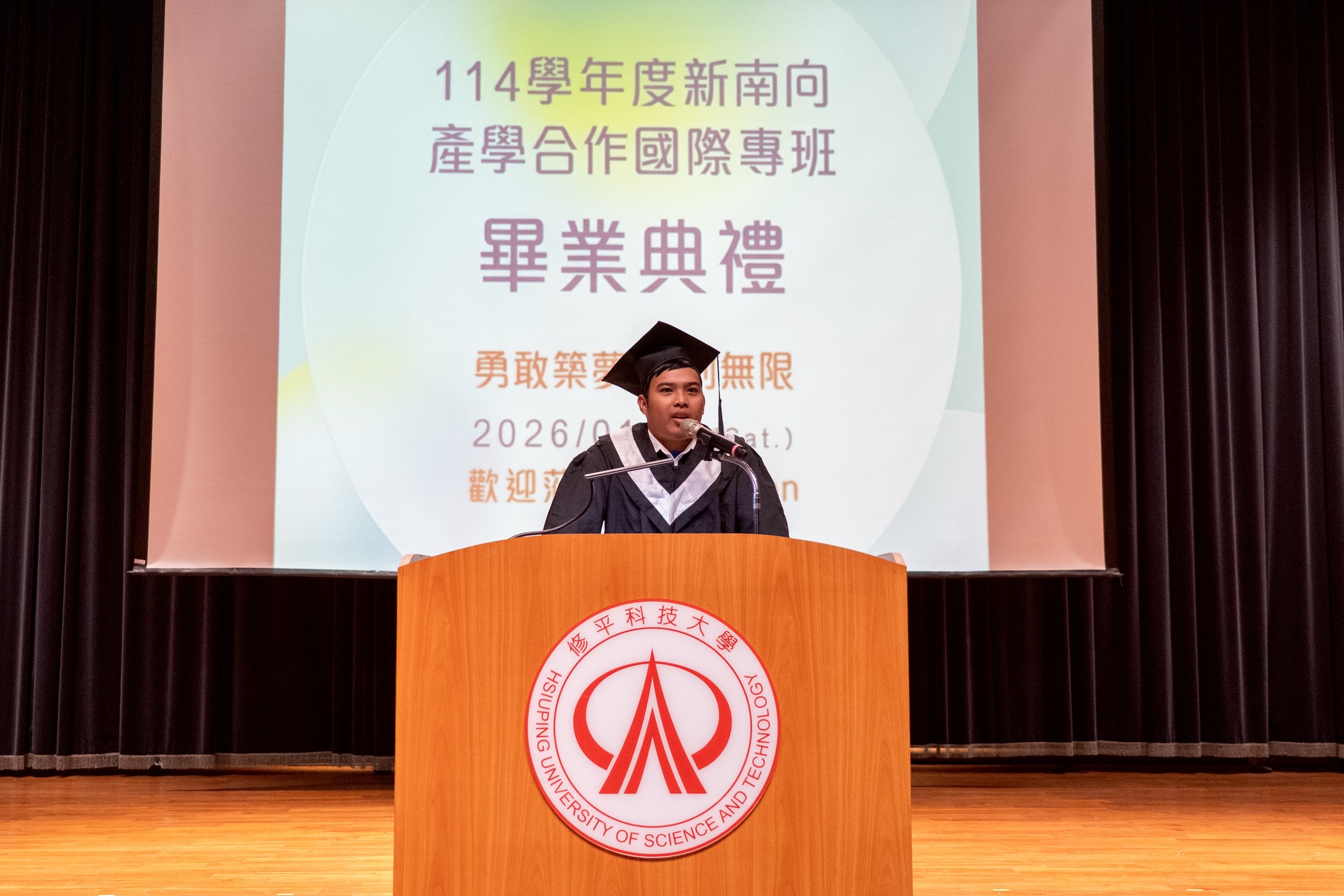 典禮中安排全體師生與來賓進行大合照,為新南向產學合作國際專班第一屆留下珍貴紀錄;隨後由畢業生陳明德演唱〈離別開出花〉,以真摯歌聲傳遞對師長與同窗的不捨與祝福,為典禮增添感動氛圍。最後,全體畢業生齊聚舞台進行拋帽儀式,象徵完成學業、展翅高飛,為本屆畢業典禮畫下溫馨圓滿的句點。