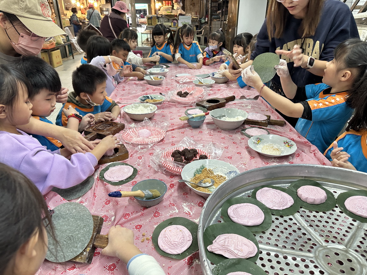 傳統的習俗裡逢年過節民眾家裡常會製作或購買紅龜粿或壽桃等做為祭祀供品,南投市一家幼兒園在農曆年關前,於13日帶領20多位幼童到公有零售市場內「碗粿霞」攤位,體驗手作紅龜粿的樂趣,小朋友對自己的作品都非常得意,很高興上了最接地氣的一課。