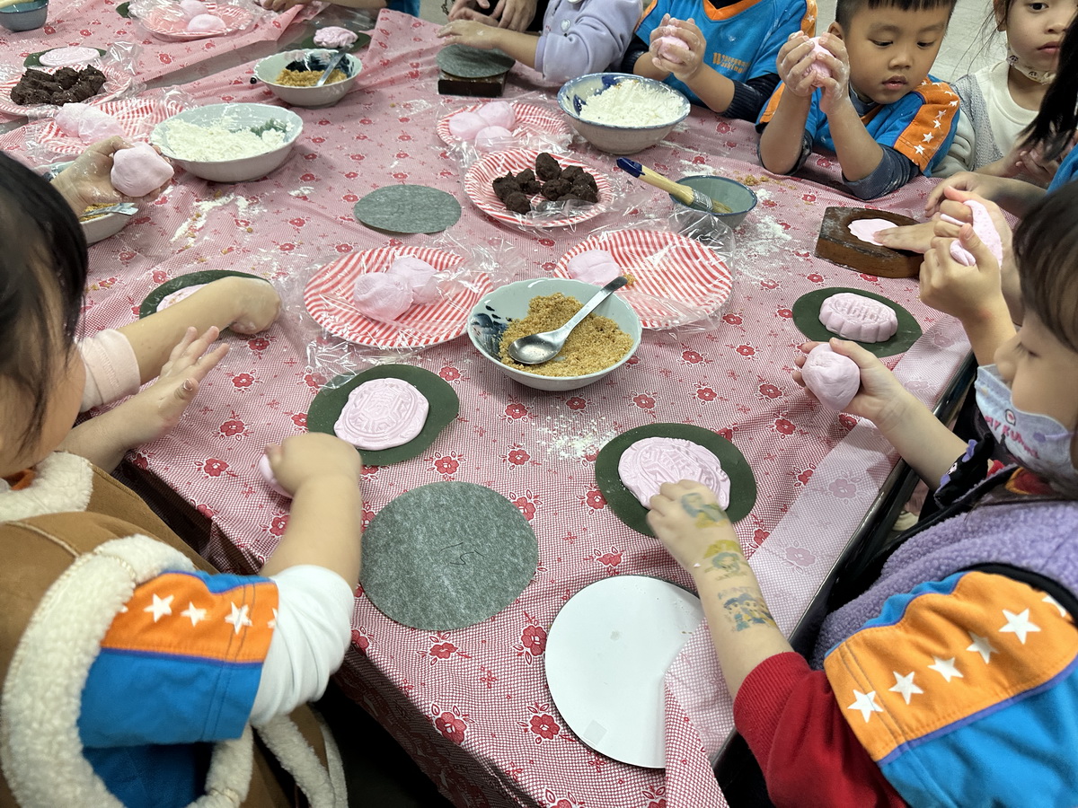小朋友在老師及黃先生指導下,每位幼童都手做二個紅龜粿,爭著要趕快放進蒸籠。有位小朋友展示她的半成品說我做了一個粉紅色的「扁扁」,旁邊一位小男童立即替她解說,她做的是「便便」,一坨便便,旁邊的大人小孩都笑了。