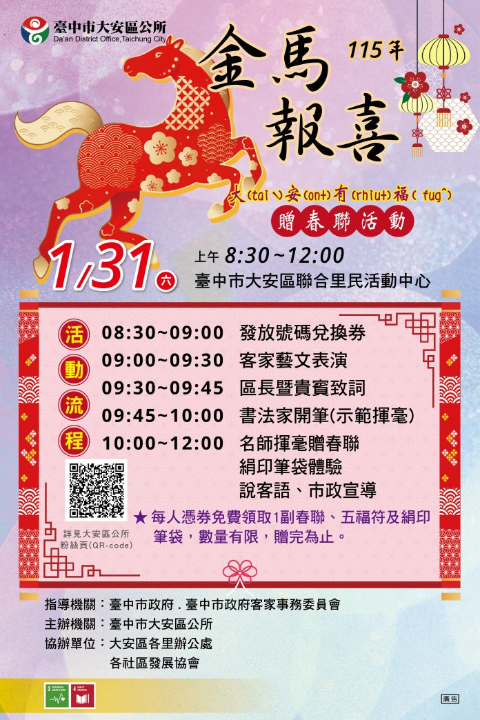 臺中市政府客家事務委員會為推廣及傳承客家文化,與大安區公所合作,訂於三十一日上午在大安區聯合里民活動中心舉辦「115年金馬報喜大安有福贈春聯活動」,與民眾一起迎接嶄新的「金馬」豐收年!