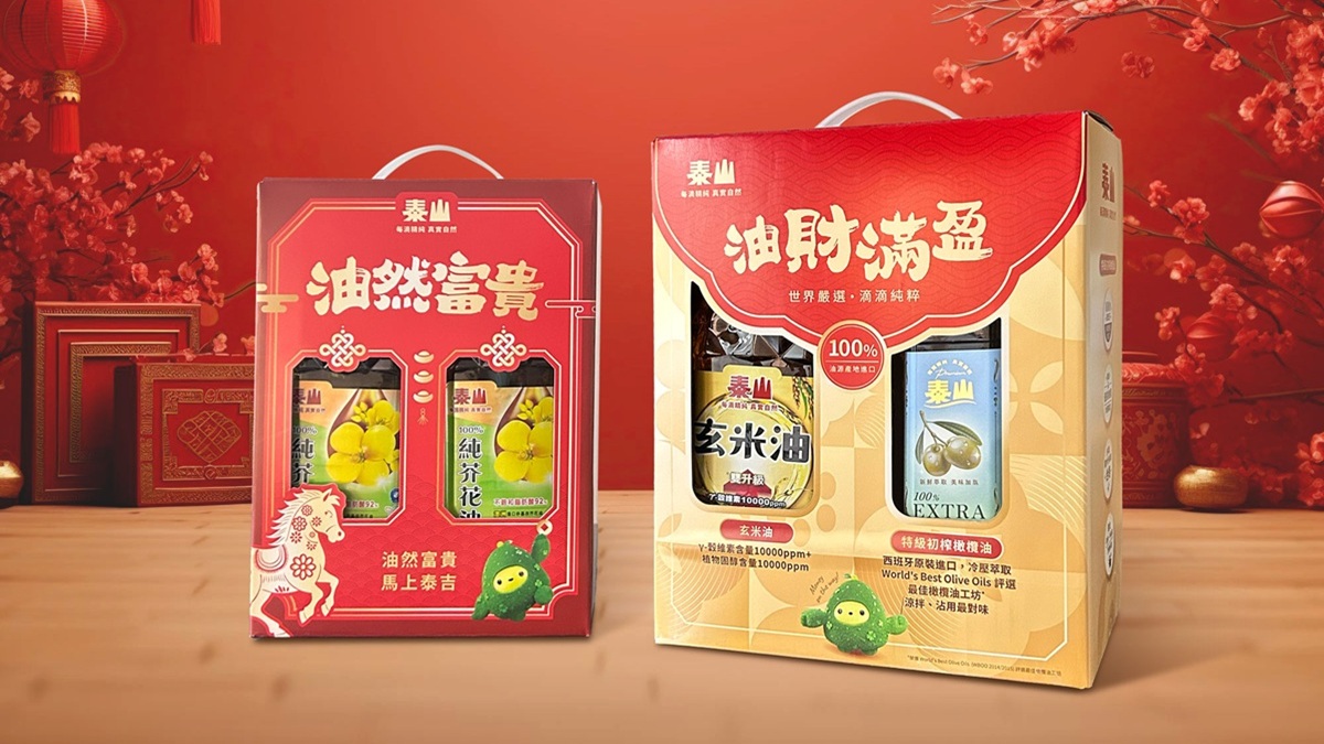 油品部分推出「油財滿盈禮盒」,主打高品質與實用兼具的人氣組合,其中包含西班牙進口泰山特級初榨橄欖油0.5公升1瓶與玄米油2公升1瓶,特價599元(原價878元),於全聯1/23–2/26獨家販售。另推出 CP 值超高的「油然富貴禮盒」兩款選擇,包括「泰山純芥花油禮盒1.5公升/2入」特價319元(原價484元),於泰山線上購物網、momo購物網、PChome 同步販售;以及「泰山不飽和調合油禮盒1.5公升/2入」特價279元(原價358元),於地區限定超市販售。